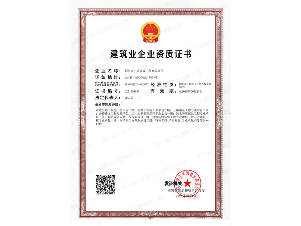 目前,公司建筑工程施工總承包資質已升級為壹級資質,公司有職工280余人,有職稱人員113人(其中高級職稱3人、中級職稱32人、初級職稱78人);各類管理上崗人員40余人;大中專學歷85余人;高中專學歷120余人。企業(yè)法人代表兼總經理:謝云君,注冊資金壹億伍仟萬元,下面設有一個分公司“四川省廣進建設工程有限公司赤水分公司”,分公司地址:貴州省遵義市赤水市太平街。
